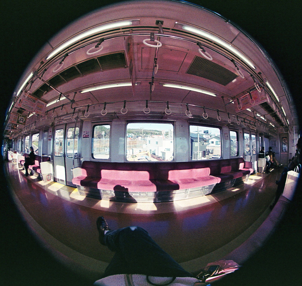 円周魚眼の方が車両の端から端まで入るので,おもしろいですね。 対角魚眼では,カメラを斜めにして対角線に車両の端が来るようにすると, 同じ面白さが出たのではないかと思います。