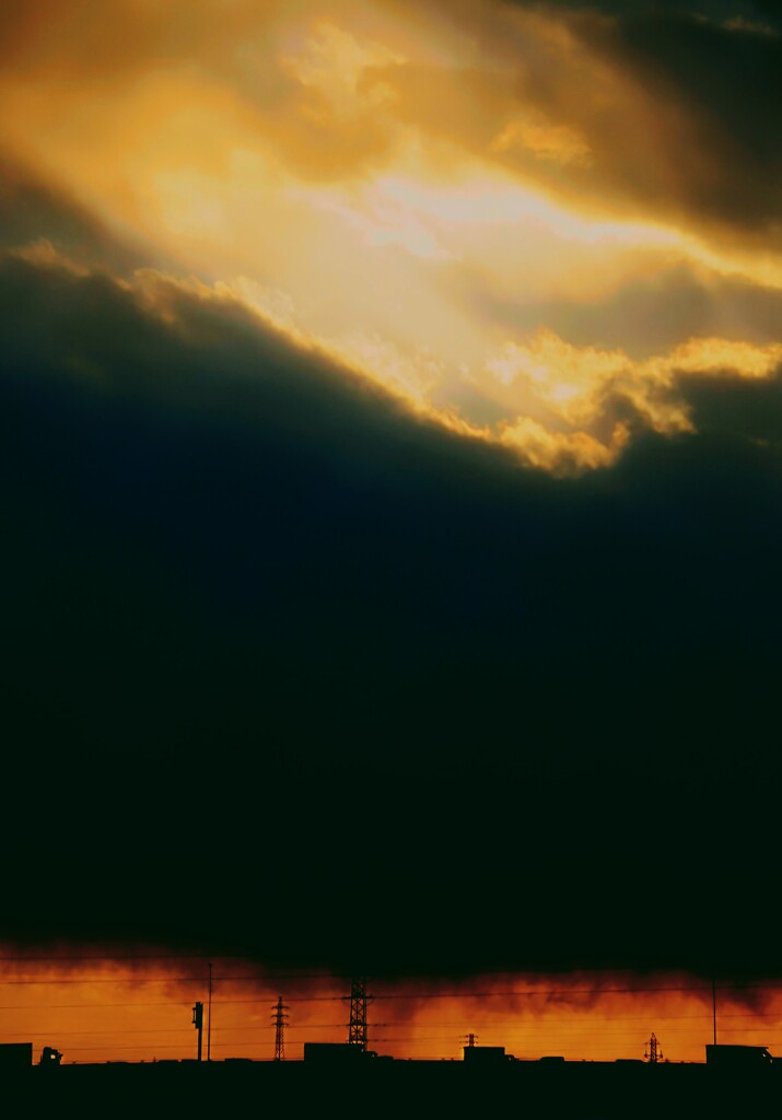 オレンジの夕焼雲に黒雲,三段かいに分かれた雲たちですね